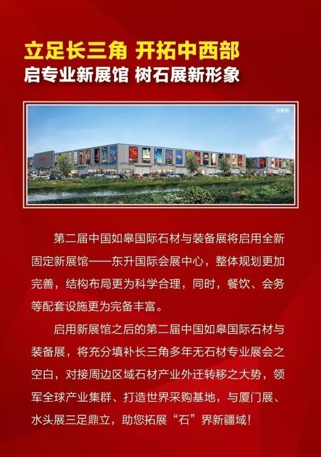洪鴻志表示,今年第二屆如皋國際石材與裝備展將啟用全新固定的新展館——東升國際會展中心,新展館在整體規(guī)劃方面更加完善,結(jié)構(gòu)布局也更為科學(xué)合理,同時,餐飲、會務(wù)等配套設(shè)施更為完備豐富。啟用新展館之后的如皋國際石材與裝備展,將充分填補長三角多年無石材專業(yè)展會的空白,對接周邊區(qū)域石材產(chǎn)業(yè)外遷轉(zhuǎn)移之大勢,領(lǐng)軍全球產(chǎn)業(yè)集群、打造世界級石材采購基地,將與廈門展、水頭展三足鼎立。