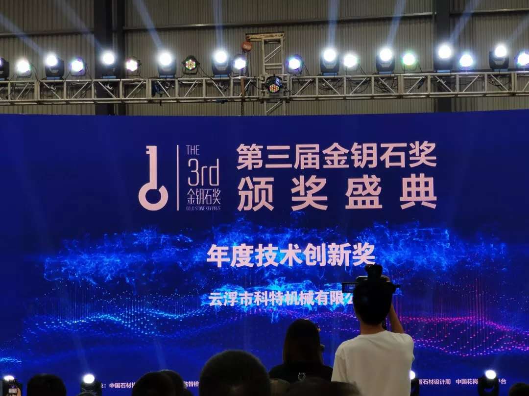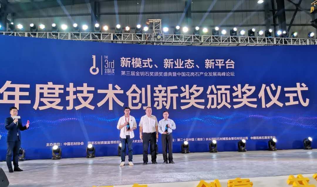 2019年11月8日下午,年度行業(yè)盛會“第三屆金鑰石獎頒獎盛典”在中國水頭石材產(chǎn)業(yè)展示運(yùn)營中心隆重舉行?铺貦C(jī)械憑借行業(yè)首創(chuàng)、自主研發(fā)的“石材信息化3P解決方案”,繼【中國建材行業(yè)技術(shù)革新一等獎】、【中國石材行業(yè)技術(shù)革新一等獎】后,又獲殊榮,摘取【第三屆金鑰石—年度技術(shù)創(chuàng)新獎】。