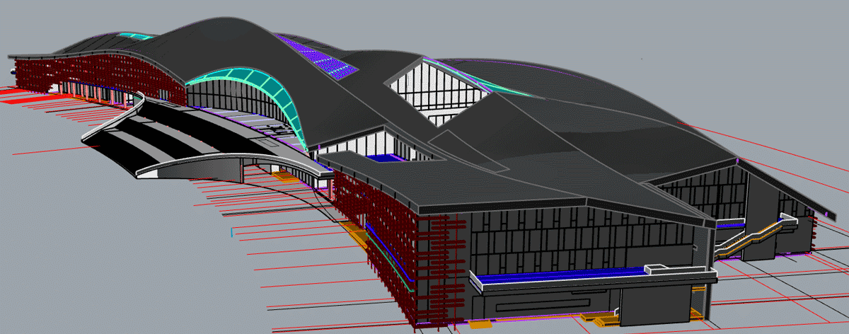 本工程結(jié)構(gòu)設(shè)計造型較復(fù)雜、幕墻體系層次復(fù)雜,博大配備高素質(zhì)的幕墻深化設(shè)計團(tuán)隊,應(yīng)用三維建模及BIM管理平臺進(jìn)行幕墻系統(tǒng)空間碰撞檢測,全力保證施工質(zhì)量和效率。