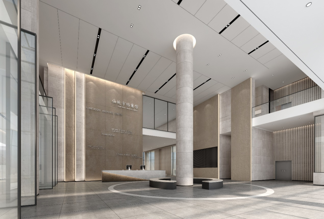 主背景墻設(shè)計(jì)靈感源于“紙張”“書本”,以大塊暖色文化石相互疊加,形成錯(cuò)層。在“紙張”之上點(diǎn)綴文字。記載著仙桃市檔案館的宗旨和重要時(shí)刻。整體設(shè)計(jì)更加符合“檔案”理念。