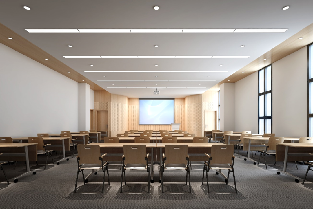 多功能教室的設(shè)計(jì)上我們將墻面和天花的木紋材質(zhì)相連,通過視線引導(dǎo)的手法,讓學(xué)員的視線集中在講臺,地面的軟性材質(zhì),可以達(dá)到輔助吸引的效果。