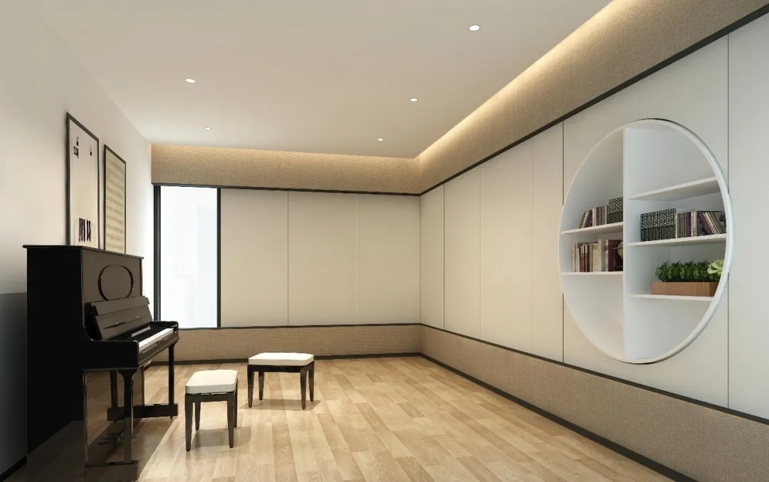 琴房的設(shè)計(jì)上,墻面采用一些卡其色的亞麻質(zhì)感的壁布,烘托一下整體空間的氛圍,讓空間光影的色性上更加柔和,墻上如畫卷展開的造型,體現(xiàn)整體空間的人文特質(zhì)。