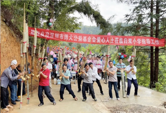 4月21日至22日,深圳市博大公益基金會(huì)理事長、集團(tuán)董事長張炳來前往貴州省黎平縣實(shí)地考察擬捐建學(xué)校場(chǎng)地,并回訪2021年交付當(dāng)?shù)卣褂玫膭?wù)孖小學(xué)。當(dāng)?shù)厝罕娸d歌載舞,熱烈歡迎理事長張炳來的到來。
