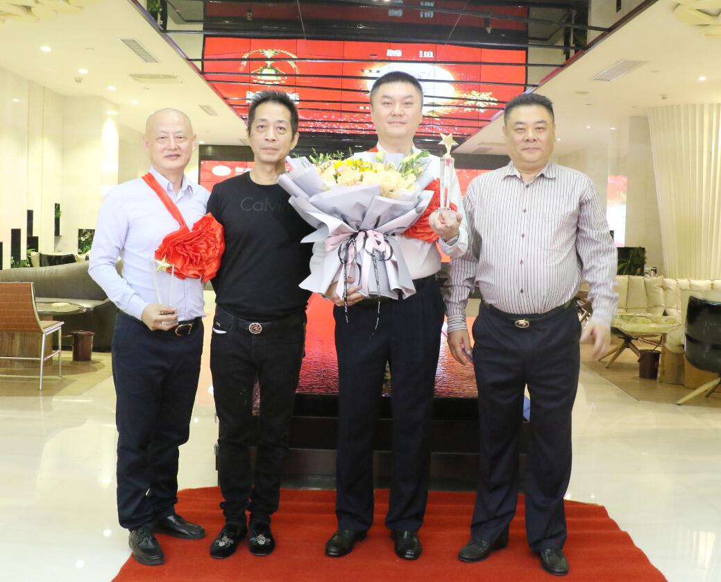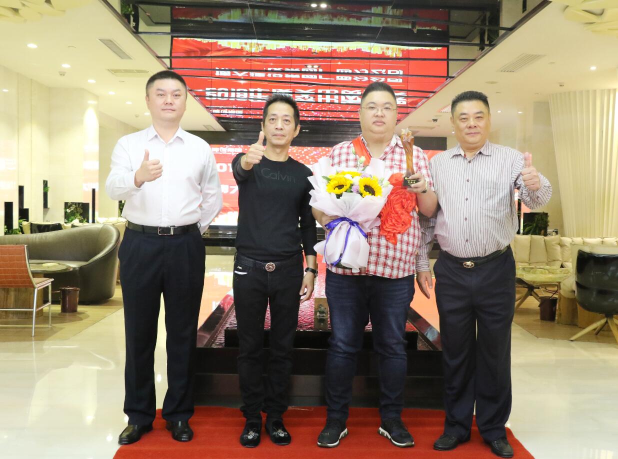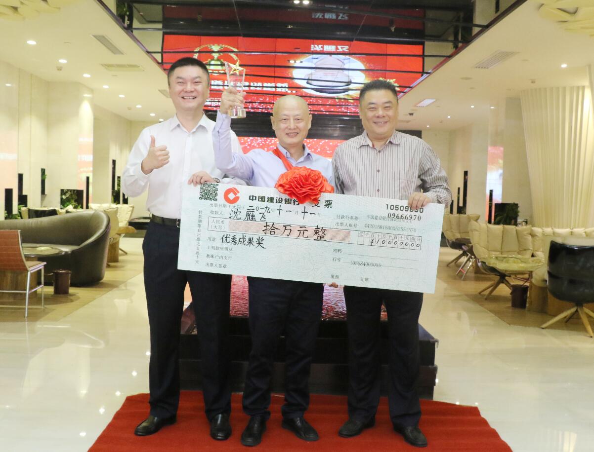 集團常務副總裁沈雁飛在集團業(yè)務拓展中做出突出貢獻,被授予優(yōu)秀成果獎,獎勵10萬元。圖為徐凱宏董事長、黃河副董事長與獲獎者合影留念。