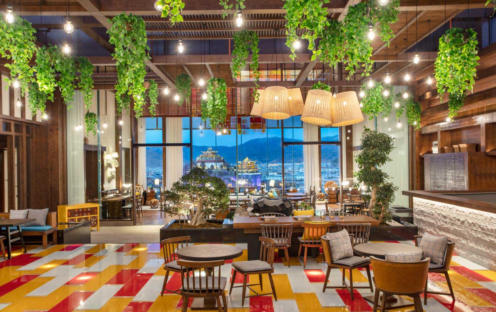 酒店大堂大氣而不失現(xiàn)代藝術(shù)美感,走進(jìn)其間,隨處可見極具當(dāng)?shù)仫L(fēng)格的藝術(shù)品與裝飾,隱約可見香巴拉的縮影。頂部設(shè)計(jì)對(duì)光影的巧妙運(yùn)用可謂巧奪天工,自然光線透過鏤空屋頂灑落下來,與地面交相輝映,且在高原寒冷地區(qū)用特色小景、綠植裝點(diǎn),讓人如同置身熱帶溫室,光影交錯(cuò)間,營(yíng)造出“眼有星河,心藏日月”的詩意畫面。