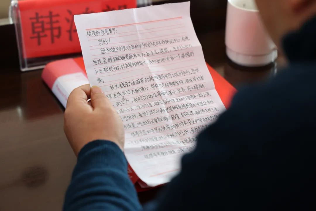 在捐贈(zèng)現(xiàn)場,一位82歲的侗族殘疾老奶奶帶來了相依為命的孫子寫的一封感謝信,黎平縣政協(xié)副主席韓鴻毅親自朗讀,為大家分享這個(gè)小學(xué)生的感謝信,童言童語情真意切,感人至深。