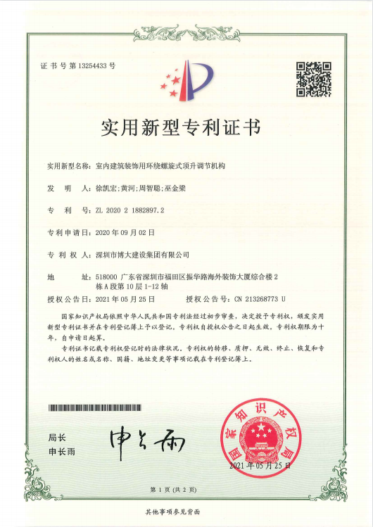 專利成果分別是《室內(nèi)建筑裝飾用環(huán)繞螺旋式頂升調(diào)節(jié)機(jī)構(gòu)》、《一種GRG吊頂安裝結(jié)構(gòu)》、《一種PC預(yù)制混凝土構(gòu)件下的特大推拉窗》、《一種帶有支撐構(gòu)件的超大空間頂轉(zhuǎn)換層結(jié)構(gòu)》、《一種單元拼接式鋁板吊頂或裝飾線條》等22項(xiàng)獲得由國家知識產(chǎn)權(quán)局頒發(fā)的專利證書。